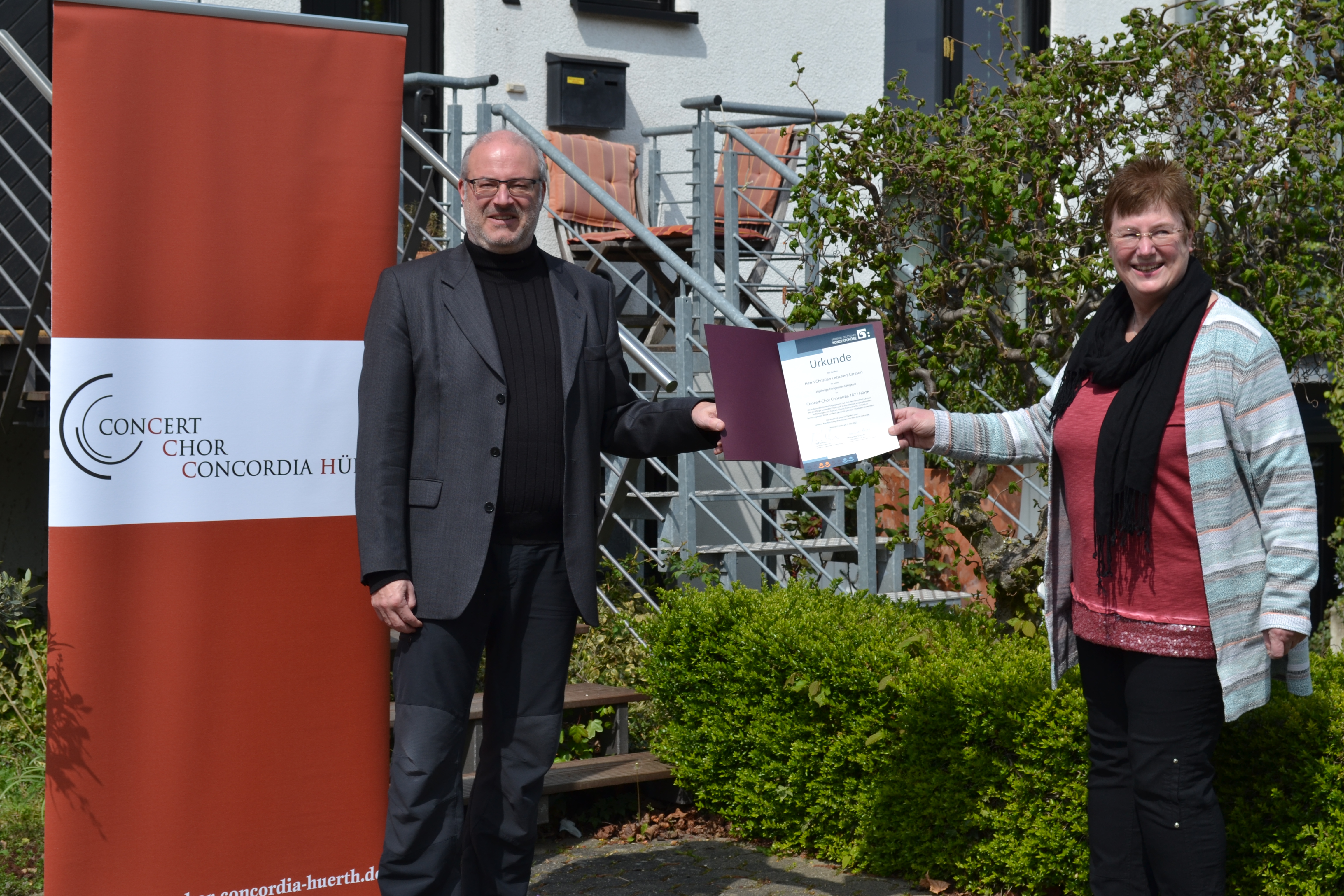 „Mit außerordentlichem Engagement hat sich Herr Letschert-Larsson bei der Pflege wertvoller Chormusik in künstlerisch anspruchsvollen Aufführungen des Concert-Chors Concordia 1877 Hürth in hervorragender Weise verdient gemacht und das Chorleben bereichert“, steht darin geschrieben.